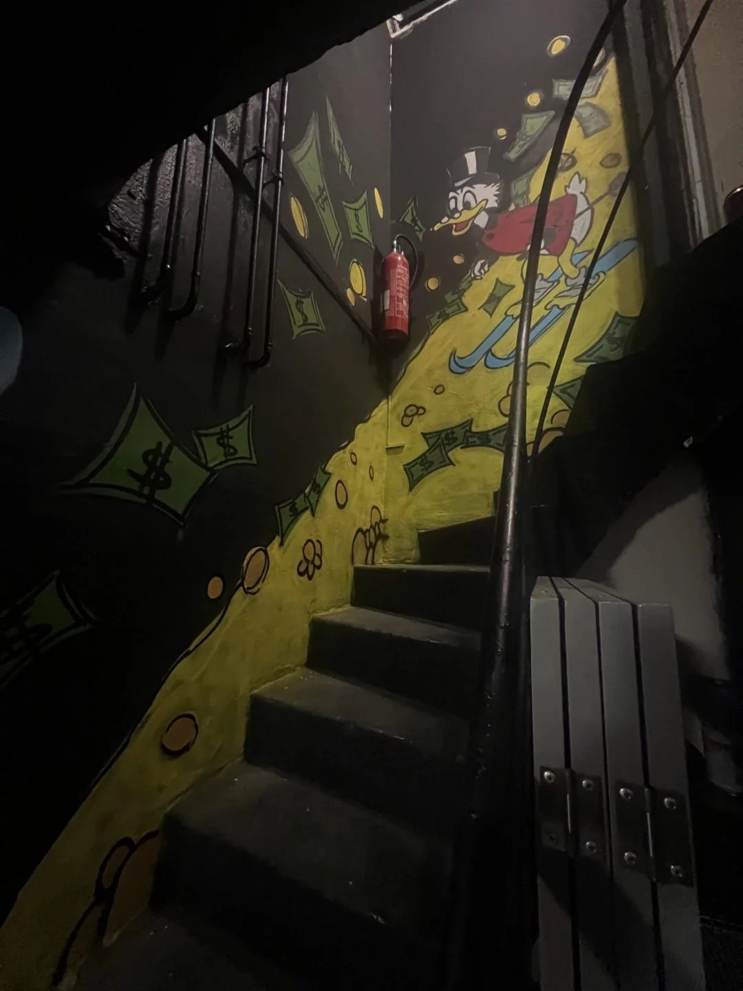 Ce projet, né de l’imagination d’un artiste qui mêle avec brio graffiti, street art et références à la culture populaire, représente non seulement un hommage à l’univers des cartoons, mais aussi un reflet du monde moderne où la richesse et l’argent sont omniprésents. Chaque détail de la fresque, des éclats de billets flottant dans l’air aux reflets métalliques de l’or, témoigne du talent exceptionnel d’Eazy One, qui transforme un simple escalier en un véritable terrain de jeu visuel.